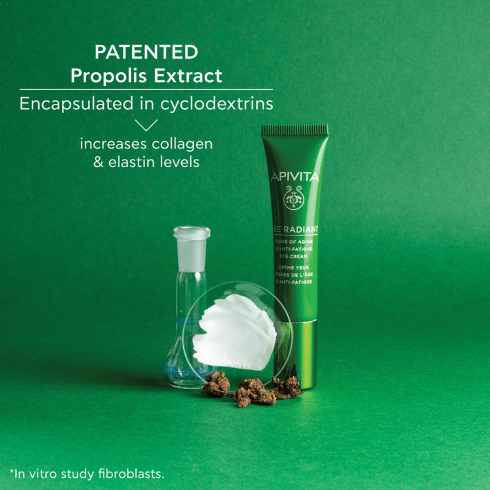 - It improves collagen, elastin & hyaluronic acid synthesis, offering a well-hydrated, more elastic, younger-looking skin, thanks to the patented propolis extract, plant glycogen and natural glycoin