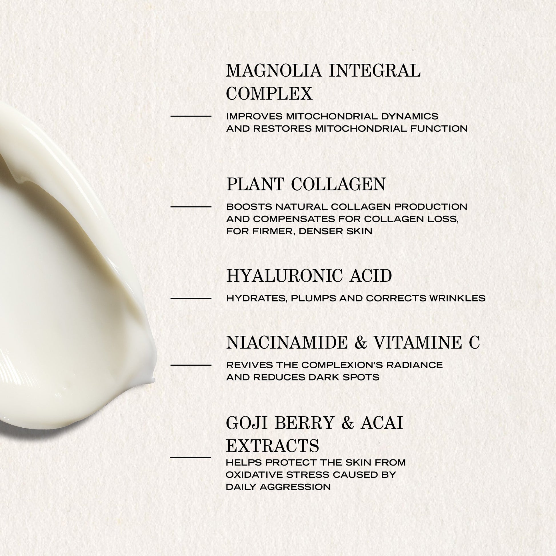 A truly exceptional youth care treatment, this cream, formulated with a complex of magnolia, plant-based collagen, and niacinamide, helps reverse visible signs of aging. It plumps, redensifies, deeply nourishes the skin, and provides lasting comfort.