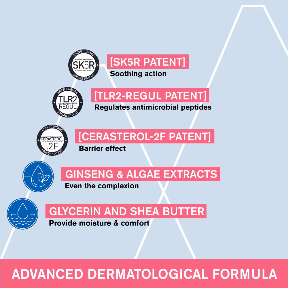 - Restores and fortifies the immunological barrier: A new patent filed by the Uriage Dermatological Laboratories combines TLR2-Regul complex and SK5R complex (Specific-Kallikrein-5-Regulator) to regulate the activity of Kallikrein-5, a protease that causes inflammation and vascular problems, and provide highly effective soothing action.